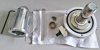 Fig. 2 – Rivelatore Everhard-Thornley smontato da un SEM Philips XL30, che mostra (da sinistra) la griglia e il tubo a +300 V, la guida di luce cilindrica trasparente, il dado di serraggio e il gruppo interno con il disco scintillatore (+10 kV) sulla parte superiore. Un fotomoltiplicatore è solitamente posizionato sul lato posteriore della guida di luce (non mostrato in figura). [Fonte dell’immagine: Wikipedia].