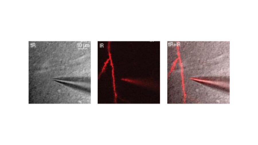 Femtonics è un’azienda specializzata nella produzione di microscopi a due fotoni e offre la possibilità di integrare dispositivi per patch-clamp direttamente sulla piattaforma di imaging, abilitando lo studio funzionale degli impulsi nervosi in modo ottimale. Grazie al software integrato, è possibile controllare con precisione il movimento della pipetta e guidarla verso la regione dendritica desiderata sfruttando l’immagine in tempo reale in modalità due fotoni (Figura 1). Per quanto riguarda l’acquisizione dati, il segnale elettrico è sincronizzato con le immagini a due fotoni, una caratteristica fondamentale per correlare la dinamica elettrica con le variazioni di calcio. Il sistema dispone inoltre di porte di ingresso/uscita (BNC) per segnali analogici e digitali, configurabili in base alle esigenze sperimentali; l’intera piattaforma è controllata via software, attraverso moduli dedicati, protocolli personalizzabili o script.